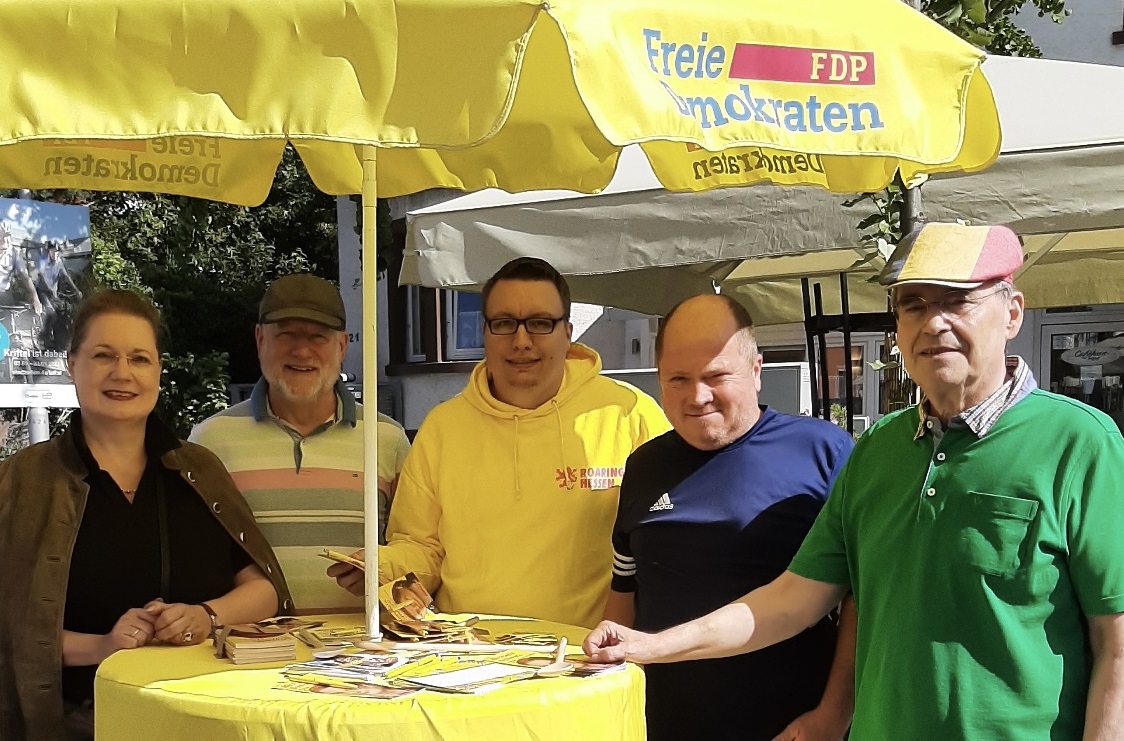 Am vergangenen Samstag ernteten Freie Demokraten um Landtags-Direktkandidatin Michaela Schwarz (2. v. l.), Ortsvorsitzendem Florian Conrad (1. v. r.), Neumitglied Joshua Klimoczko (2. v. r.) ...